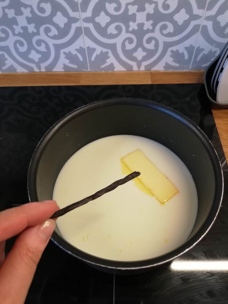 Etape 1 : couper une gousse de vanille en 2 (on va utiliser 1/2 seulement pour la recette). Fendre en deux sur la longueur et racler les graines avec la pointe du couteau. Faire bouillir le lait avec la gousse ainsi que les graines de vanille et le beurre. Attends pas que ça déborde ou ça crame au fond de la casserole mais si tu as une petite pellicule qui se forme à la surface, c’est normal et c’est signe qu’il faut retirer la casserole du feu. Laisser reposer hors du feu